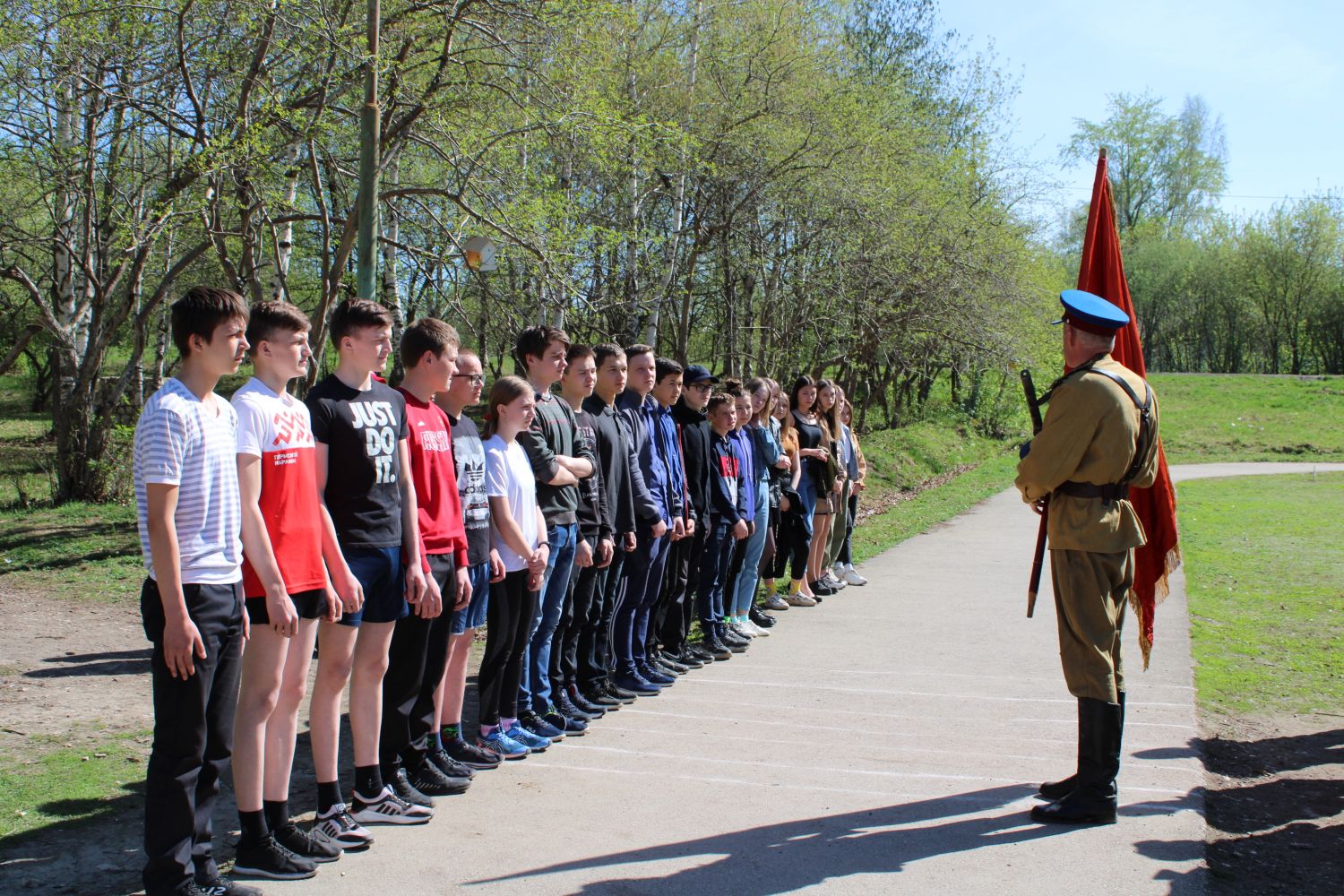 Председатель Общественного совета при ОМВД России по Лысьвенскому городскому округу, Андрей Батуев, рассказал ребятам о подвиге советского народа в войне над фашизмом, призвав бережно хранить память о той страшной войне, чтобы никто не смог исказить историю, и умалить роль русского солдата в Великой Победе 1945 года над фашистскими захватчиками. Школьники с большим уважением и вниманием слушали выступающего, специально для своего выступления Андрей Николаевич подготовил военную форму периода Великой Отечественной войны.