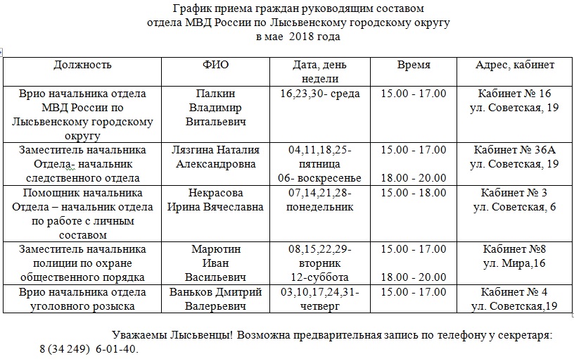 График приема граждан руководящим составом отдела МВД России по Лысьвенскому городскому округу в мае 2018 года