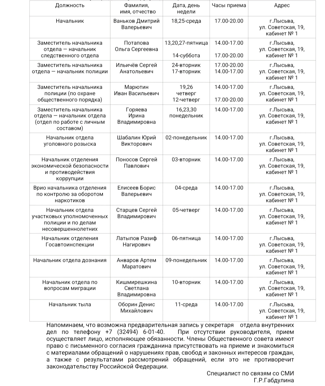 Информация о графике приема граждан руководящим составом отдела МВД России по Лысьвенскому городскому округу в декабре 2024 года