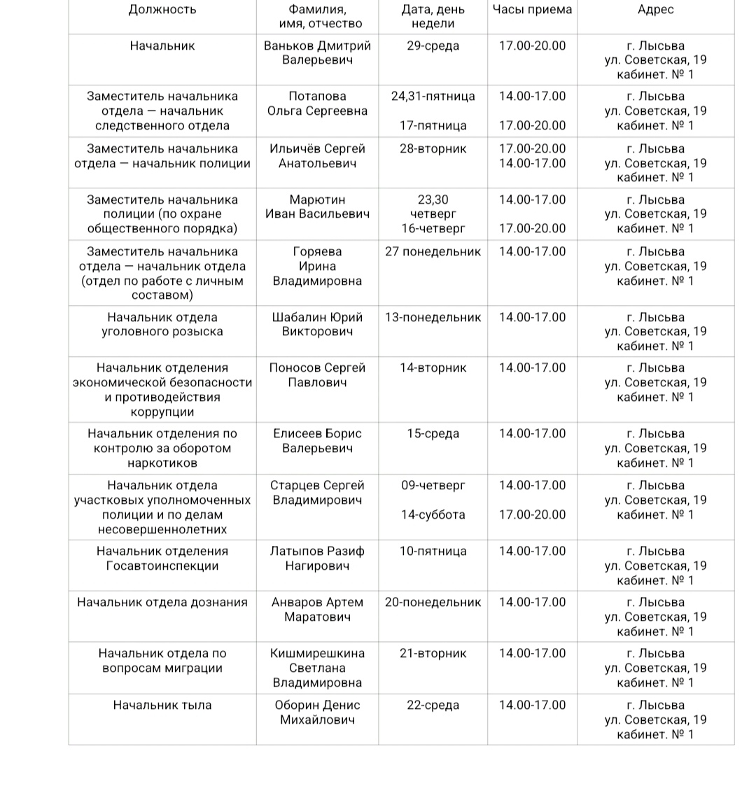 Информация о графике приема граждан руководящим составом отдела МВД России по Лысьвенскому городскому округу в январе 2025 года