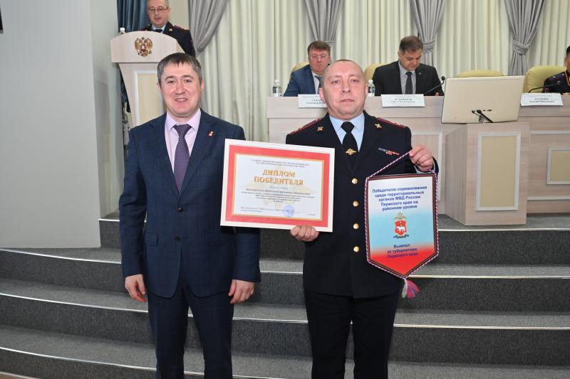 Руководители подразделений получили почетные грамоты и переходящие вымпелы из рук губернатора Пермского края Дмитрия Махонина, врио начальника регионального МВД генерал-майора полиции Аяса Кандана и председателя Совета ветеранов органов внутренних дел и внутренних войск Пермского края Валерия Кокшарова.