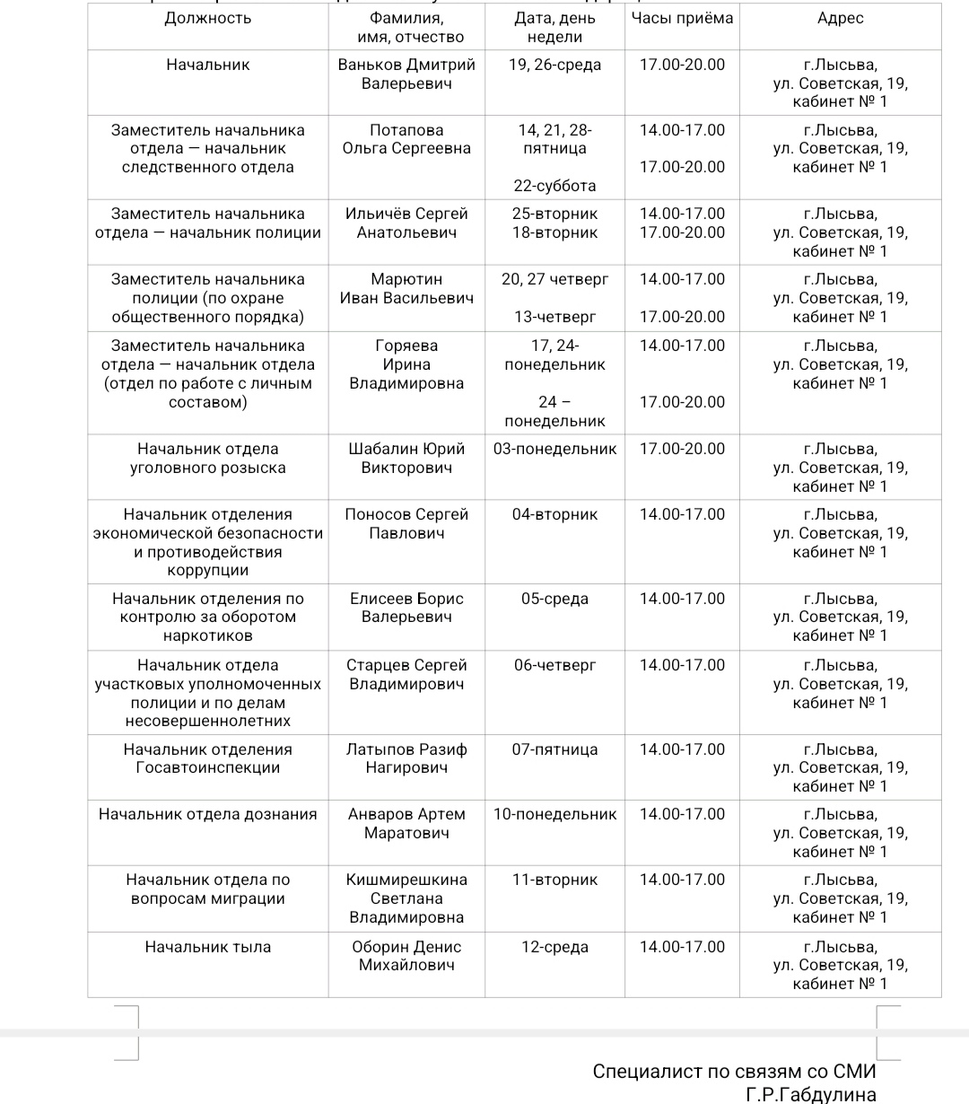 Информация о графике приёма граждан руководящим составом отдела МВД России по Лысьвенскому городскому округу в марте 2025 года