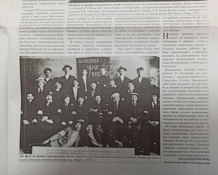 - Как подтверждают исторические документы у истоков становления лысьвенской милиции стояли большевики Белобородов, Страутман, Светлаков, - рассказывает председатель Совета ветеранов отдела внутренних дел Алексей Машковцев. Начальником милиции был избран В. Светлаков, а его заместителем Ян Страутман. Имена сотрудников лысьвенской милиции вписаны в историю родного города и в названия улиц, - подчеркнул Алексей Николаевич.