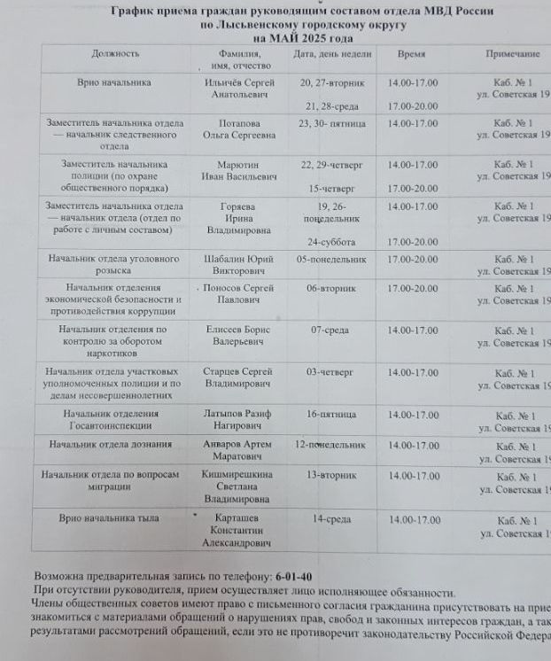 Уважаемые жители Лысьвенского муниципального округа, информируем вас о графике приёма граждан руководящим составом отдела МВД России по Лысьвенскому городскому округу в мае 2025 года. Информируем вас, что возможна предварительная запись по телефону +7(34 249)6-01-40. При отсутствии руководителя, прием осуществляет лицо, исполняющее обязанности.