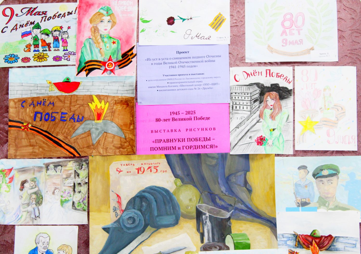 В Лысьвенском отделе внутренних дел рисунки детей полицейских, ребят из ОПО «ЩИТ», воспитанников детского сада № 26 оформлены на выставке «Правнуки Победы – ПОМНИМ и ГОРДИМСЯ!», в рамках реализации проекта, приуроченного к 80-летию Победы