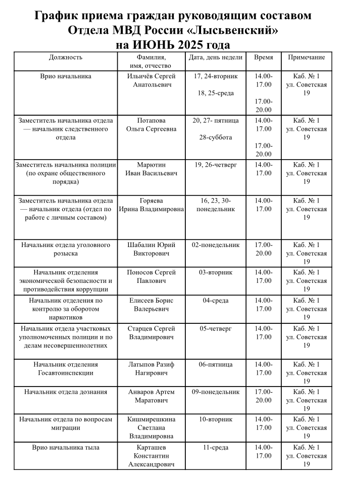 Информация о графике приёма граждан руководящим составом отдела МВД России «Лысьвенский» в июне 2025 года