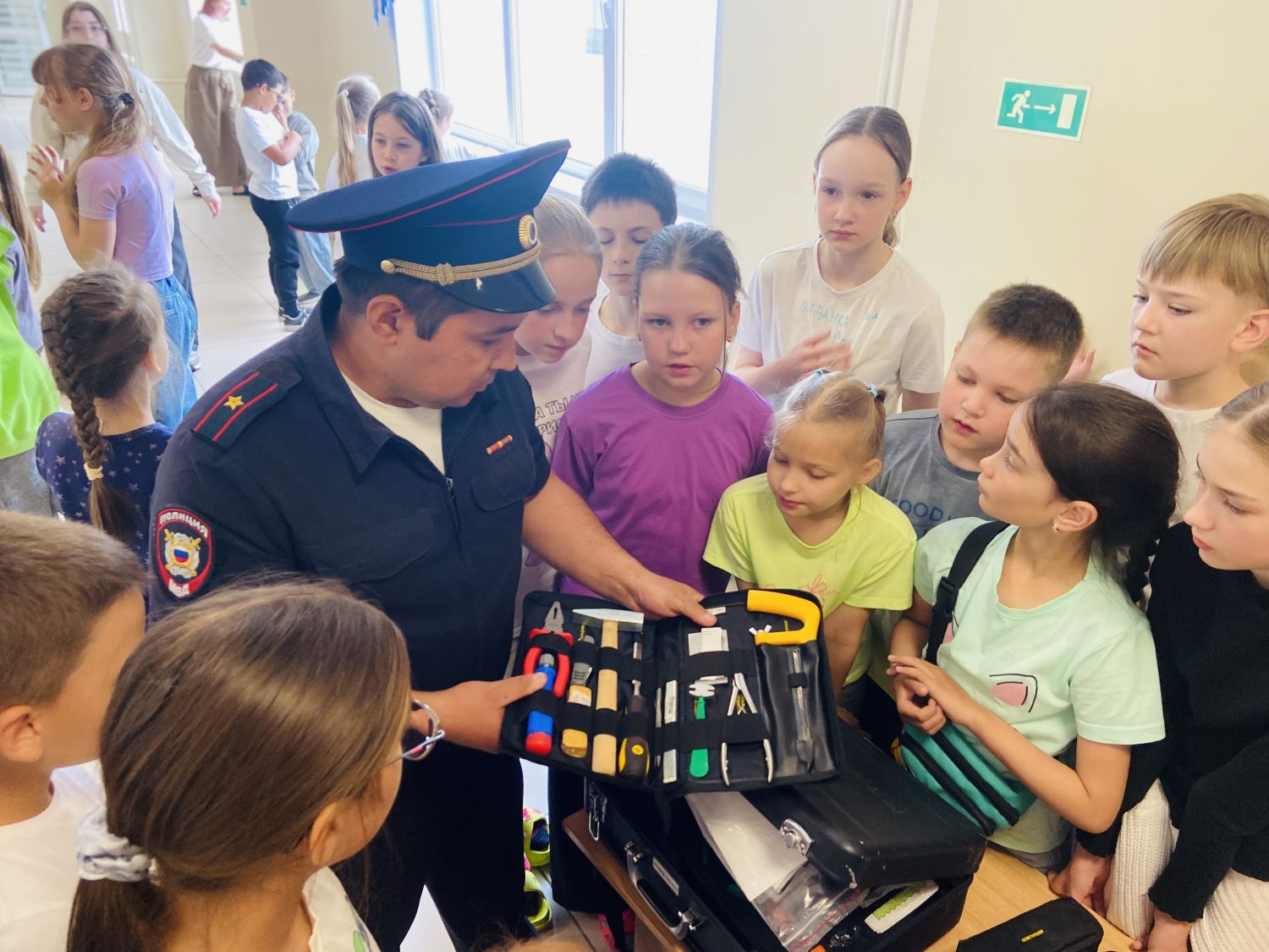 Сотрудники Госавтоинспекции повторили с ребятами правила дорожного движения для пешеходов и велосипедистов, особое внимание уделив «летним» средствам передвижения: велосипеды, самокаты, ролики, электросамокаты, моноколёса, а также рассказали о службе сотрудников ДПС, и продемонстрировали служебный автомобиль.