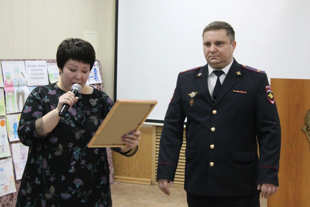 Учащиеся школ № 11 и №13 подарили в этот праздничный день плакаты и рисунки, которые были оформлены и представлены тематической выставкой «Поздравляем полицейских!», организованной в актовом зале ОМВД.