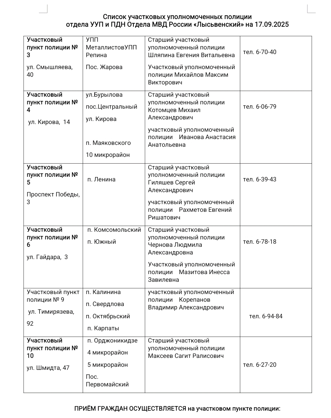 отдела УУП и ПДН Отдела МВД России «Лысьвенский» на 17.09.2025