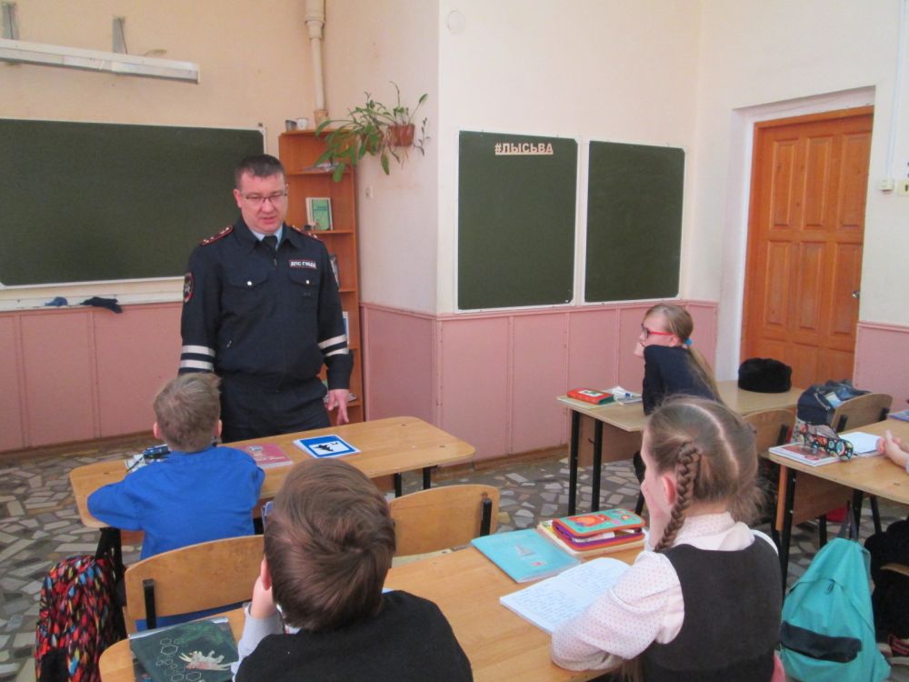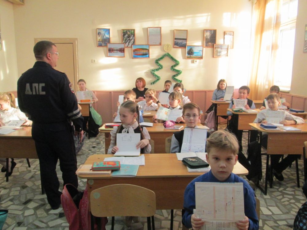 Полицейский повторил с учащимися Правила дорожного движения, и рассказал об ответственности, которая предусмотрена для детей-пешеходов, нарушающих ПДД, а так же проверил в дневниках учащихся схему маршрута «Дом – школа - дом», согласно которому ребята добираются до школы и обратно.