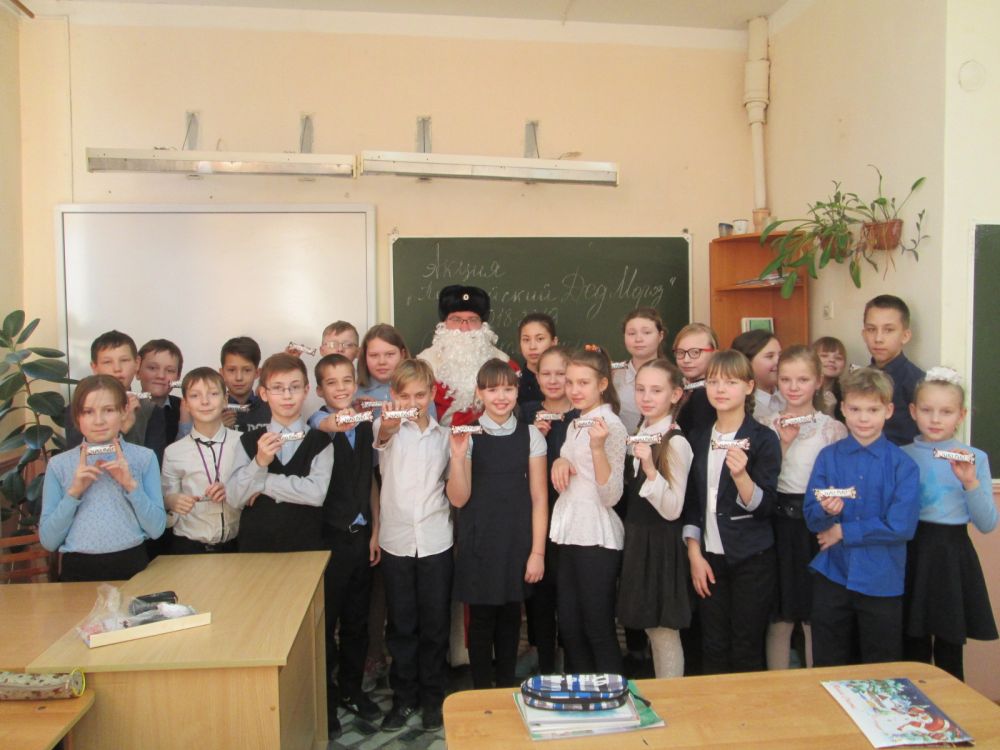 Закончилось праздничное профилактическое мероприятие подарками и сладкими угощениями, которые полицейский Дед Мороз раздал школьникам, и, конечно, общим фото на память.
