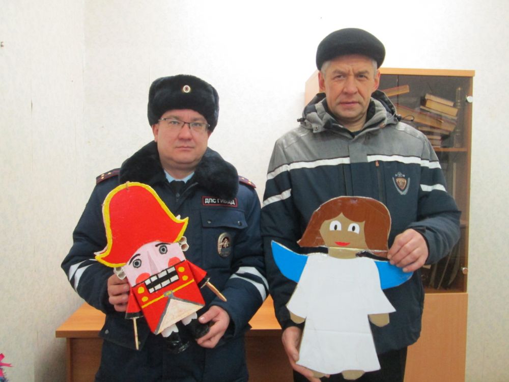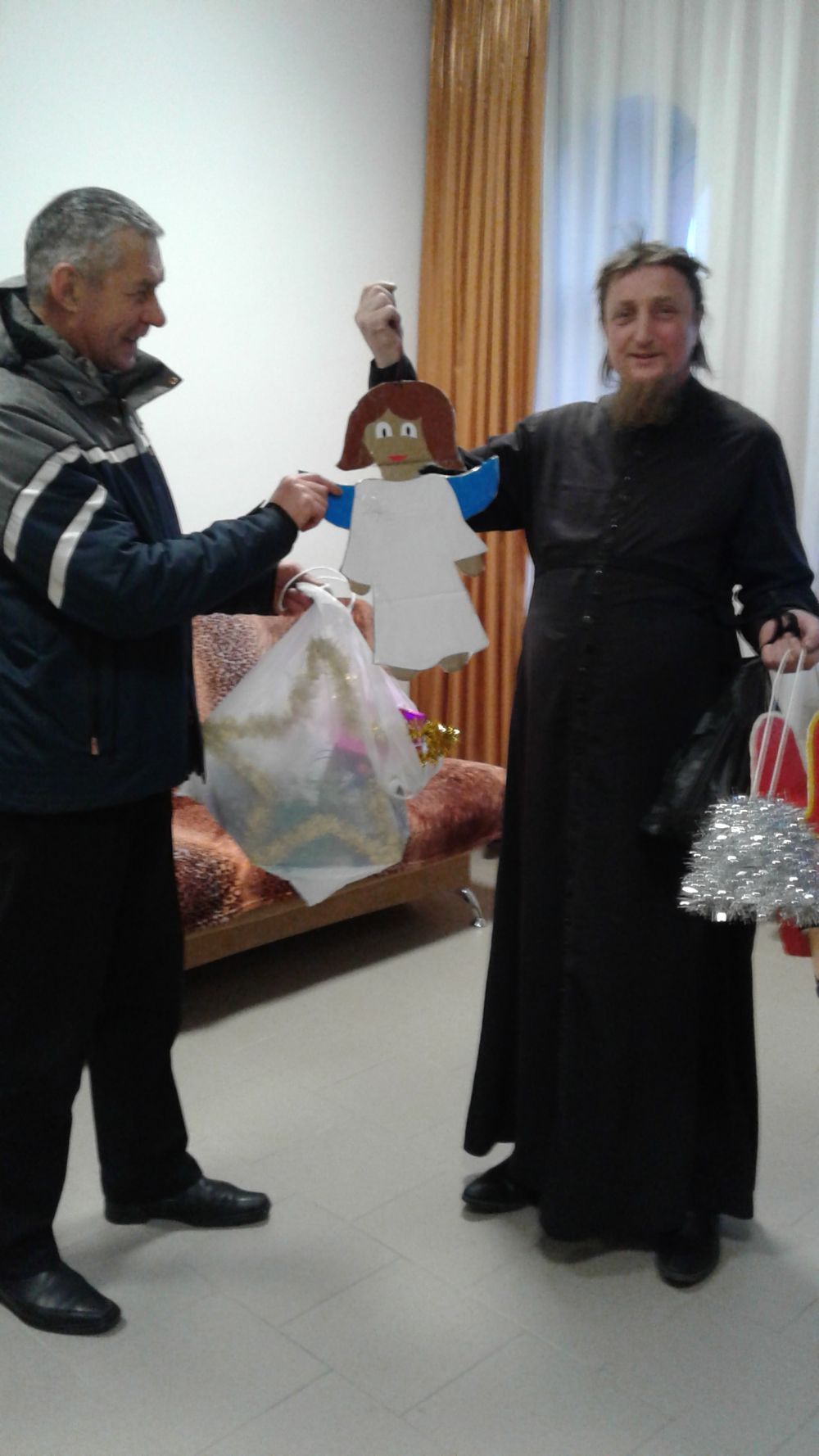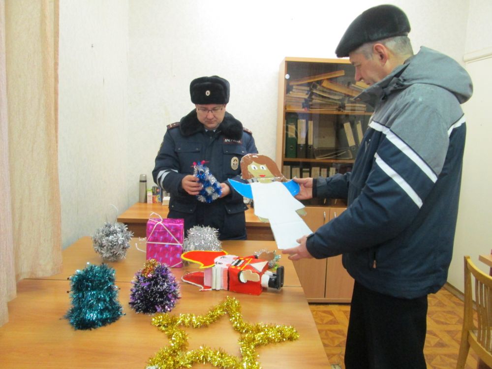 В период с 14 декабря по 25 декабря 2018 года ребята изготавливали елочные уличные игрушки, а сегодня, в последний день акции, председатель Общественного совета Андрей Батуев и полицейский Дед Мороз Александр Иутин, выбрав самые лучшие изделия детей и взрослых, передали их отцу Софронию в Свято – Троицкий храм.