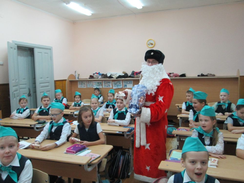 Сегодня полицейский Дед Мороз встретился с ребятами из школьного отряда юных инспекторов движения «БОНД» в одном из образовательных учреждений города. Отряд проводит профилактические акции и выступления агитбригады в начальной школе под девизом «Будьте Осторожны На Дорогах!»