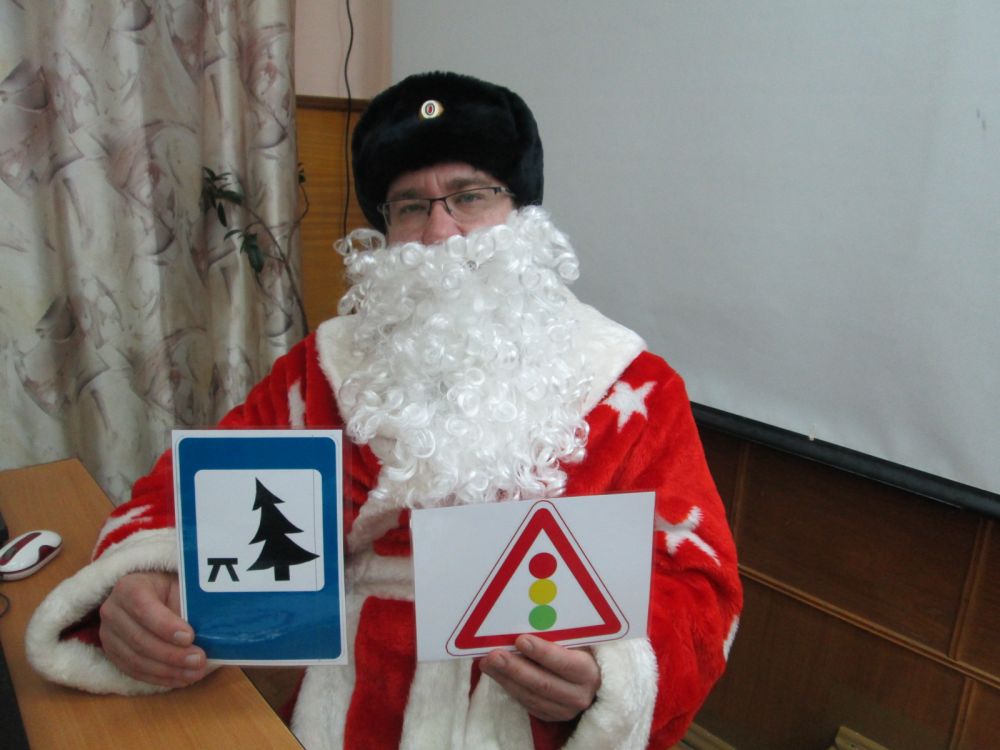 Ребята сумели проявить и чувство юмора, отгадав шутку полицейского Деда Мороза, какие из знаков дорожного движения можно назвать «новогодними».