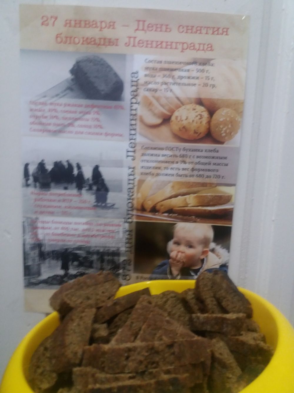 Общественники совместно с педагогами и учащимися одного из образовательных учреждений города организовали и провели акцию «Блокадный хлеб», приуроченную ко Дню полного освобождения Ленинграда от блокады в 1944 году, для того, чтобы вспомнить эти страшные события и отдать дань глубокого уважения героическим защитникам Ленинграда.