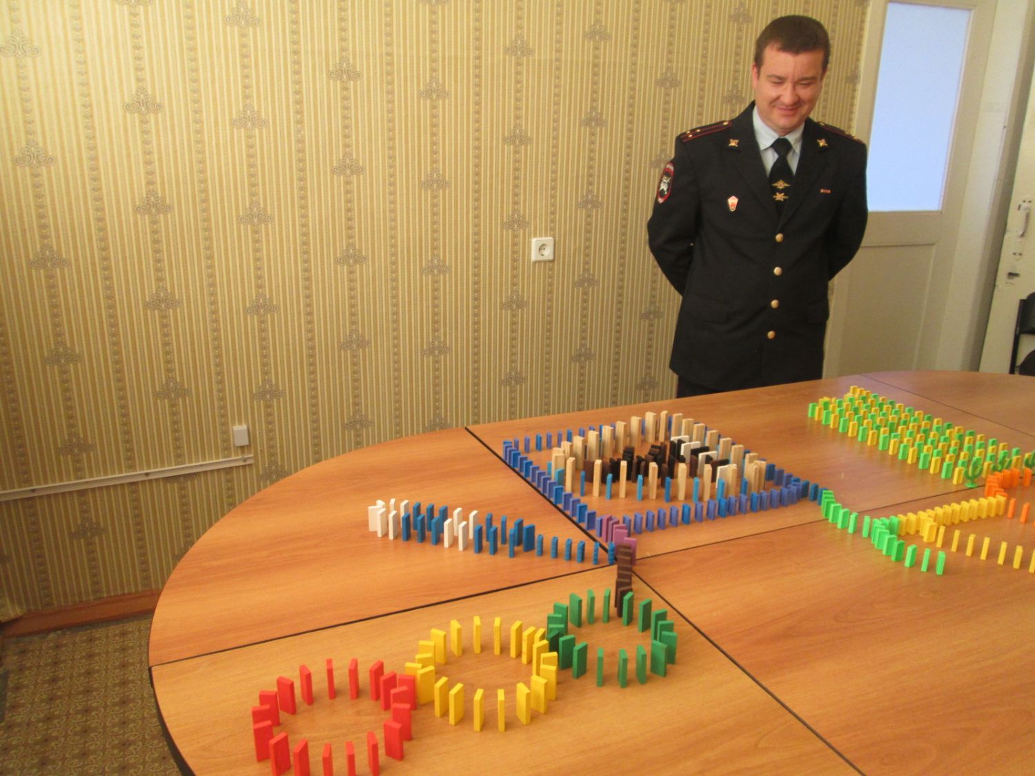 Дети, в свою очередь, смогли удивить и порадовать гостей в погонах. Специально для этого мероприятия девочки и мальчики приготовили сюрприз. С помощью общественников и родителей, используя домино они рассказали свои дорожные истории, выложив цветной светофор, жезл полицейского, пешеходный переход, велосипед. Важно отметить, что на подготовку сюрприза ушло несколько часов. Мероприятие получилось очень полезным и интересным, эффект домино взывал настоящий восторг у всех участников!